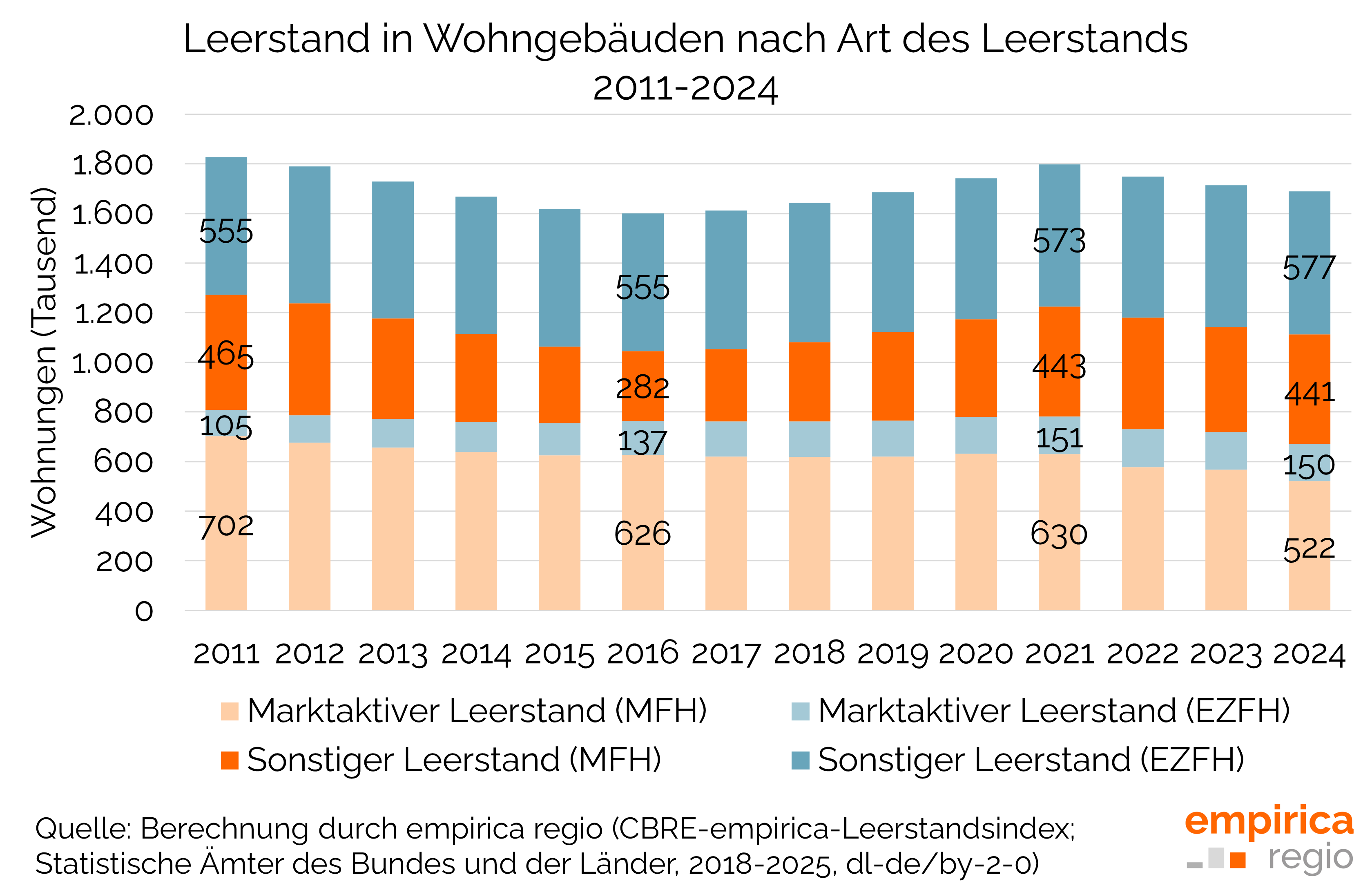 Die Leerstandszahlen von empirica beziehen sich ausschließlich auf Wohngebäude. Sie differenzieren sowohl bei den Ist-Zahlen wie auch bei den Prognosen Wohnungen in Mehrfamilienhäusern (MFH) und in Ein-/Zweifamilienhäusern (EZFH). Eine wesentliche Rolle spielt dabei die Unterscheidung zwischen dem marktaktiven Leerstand, der kurzfristig beziehbare Objekte umfasst, und dem sonstigen Leerstand, in dem auch dysfunktionale Gebäude oder Ruinen zusammengefasst werden. Der totale Leerstand lag Ende 2024 bei 1,689 Mio. Wohnungen. Im Vergleich zum Vorjahr 2023 war das Leerstandsvolumen bundesweit leicht rückläufig und verringerte sich um etwa 25.000 Einheiten.